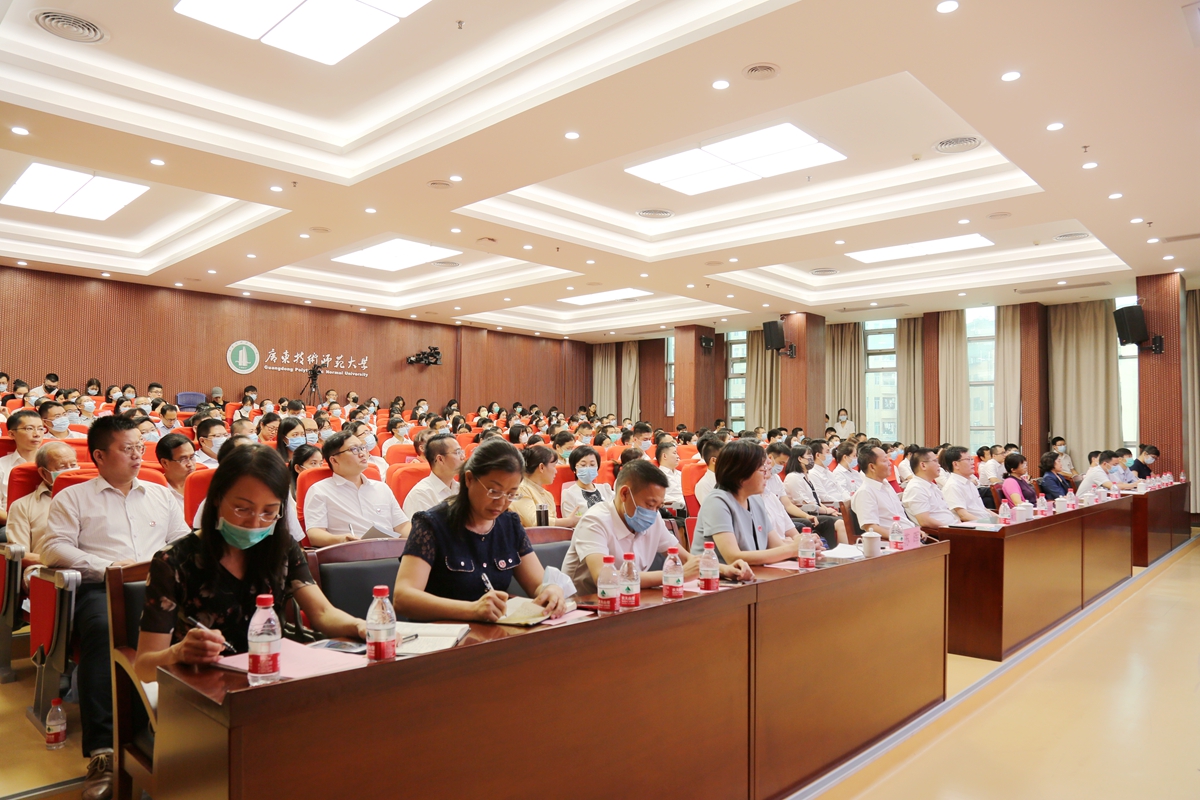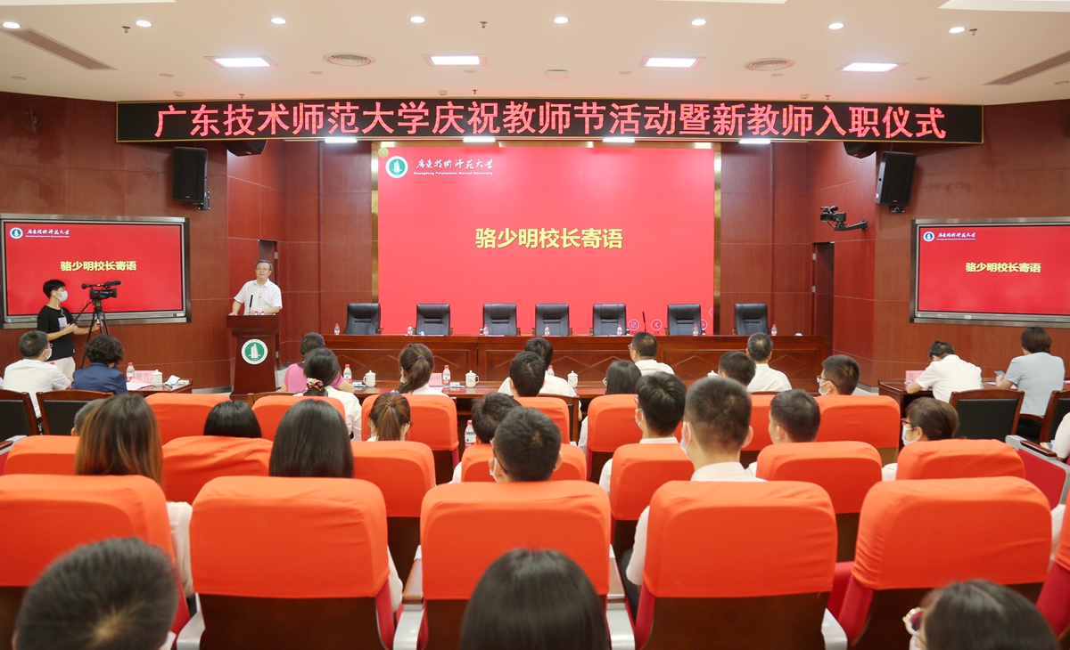 骆少明发表了热情洋溢、鼓舞人心的讲话。他表示,新教师选择加入我校,恰逢其时,这是学校事业发展的最好时期。自2018年成功更名大学后,学校这几年的发展非常可喜,站在大学新的起点上,朝着做大做强、建设中国特色世界水平技术师范大学大踏步前进,在办学体量、校舍面积、师生规模、博士数量等方面均翻了一番,“再造了一个广师大”。骆少明指出,学校的发展日新月异,一系列成绩的取得离不开上级党委政府的正确领导、学校领导班子的科学谋划和全校师生的共同努力;学校要做大做强,既需要优秀教师发挥骨干力量、老教师发挥传帮带作用,也离不开新引进教师们的努力。骆少明引用《后汉书》中的“人生在勤,不索何获”鼓励新教师,希望他们不断提升师德修养、提高教学水平、强化科研能力,脚踏实地,崇尚行动,助力学校紧紧抓住当前的发展机遇,继续乘风破浪、乘势而上,实现学校“十四五”规划的既定目标,也在奋斗中实现个人的“五年目标”,实现个人的价值追求。