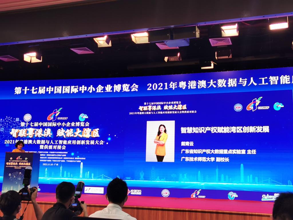 会上,戴青云以《智慧知识产权,赋能湾区中小企业创新发展》为题作主题报告。她从“知识产权如何推动创新?”“知识产权如何实现智能”“AI+知识产权研究进展”和“AI+知识产权应用展望”四个方面进行解读和分析,力求为中小企业的创新发展探寻重点和突破点。最后,戴青云还介绍了广东省知识产权大数据重点实验室的研究进展情况。