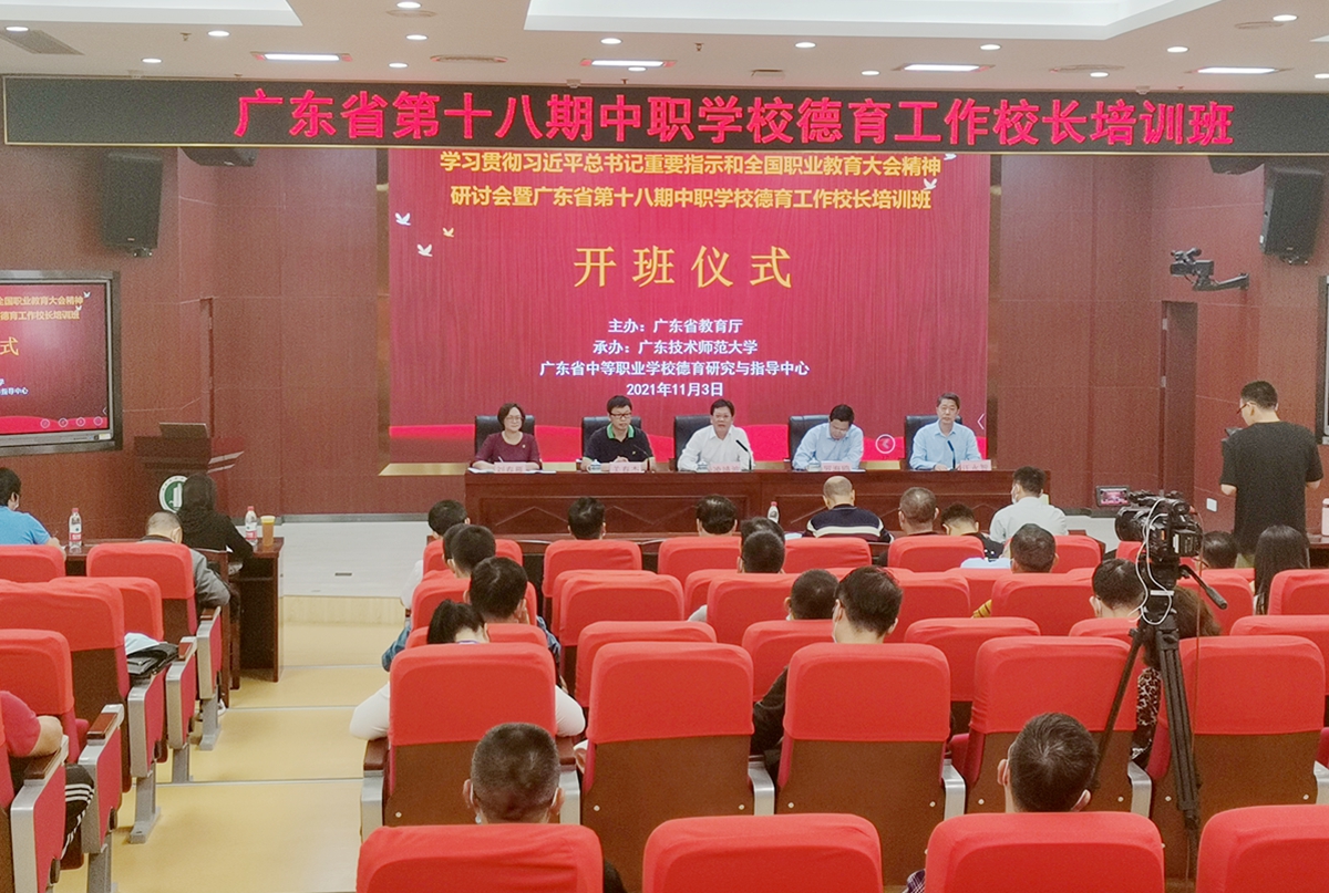 11月3日至5日,由广东省教育厅主办,广东技术师范大学和广东省中等职业学校德育研究与指导中心承办的学习贯彻习近平总书记重要指示和全国职业教育大会精神研讨会暨广东省第十八期中职学校德育工作校长培训班在广东技术师范大学举行。广东技术师范大学党委书记凌靖波,省教育厅思想政治工作与宣传处副处长关春杰,广东开放大学原党委书记罗海鸥研究员出席开班仪式,来自全省各地近100名中职校长、副校长参加了开班仪式。开班仪式由省中等职业学校德育研究与指导中心主任汪永智教授主持。