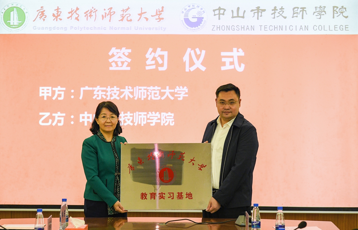 随后,我校与中山市技师学院签订《教育实习基地建设协议》。许玲代表学校向中山市技师学院授予“广东技术师范大学教育实习基地”牌匾,禹建华代表中山市技师学院接受牌匾。