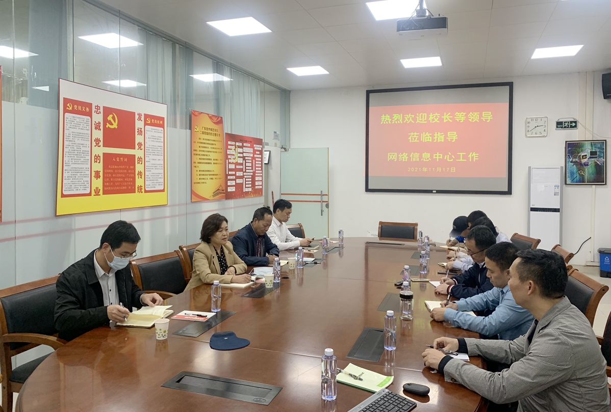 11月17日,学校校长戴青云、副校长黄秋文到网络信息中心调研信息化工作,校长办公室、规划处负责人随同调研。戴青云一行考察了东校区新建的数据中心机房,详细了解了该数据中心机房的功能、运行和应用情况,并与网络信息中心领导班子和各科室负责人进行了工作座谈交流。