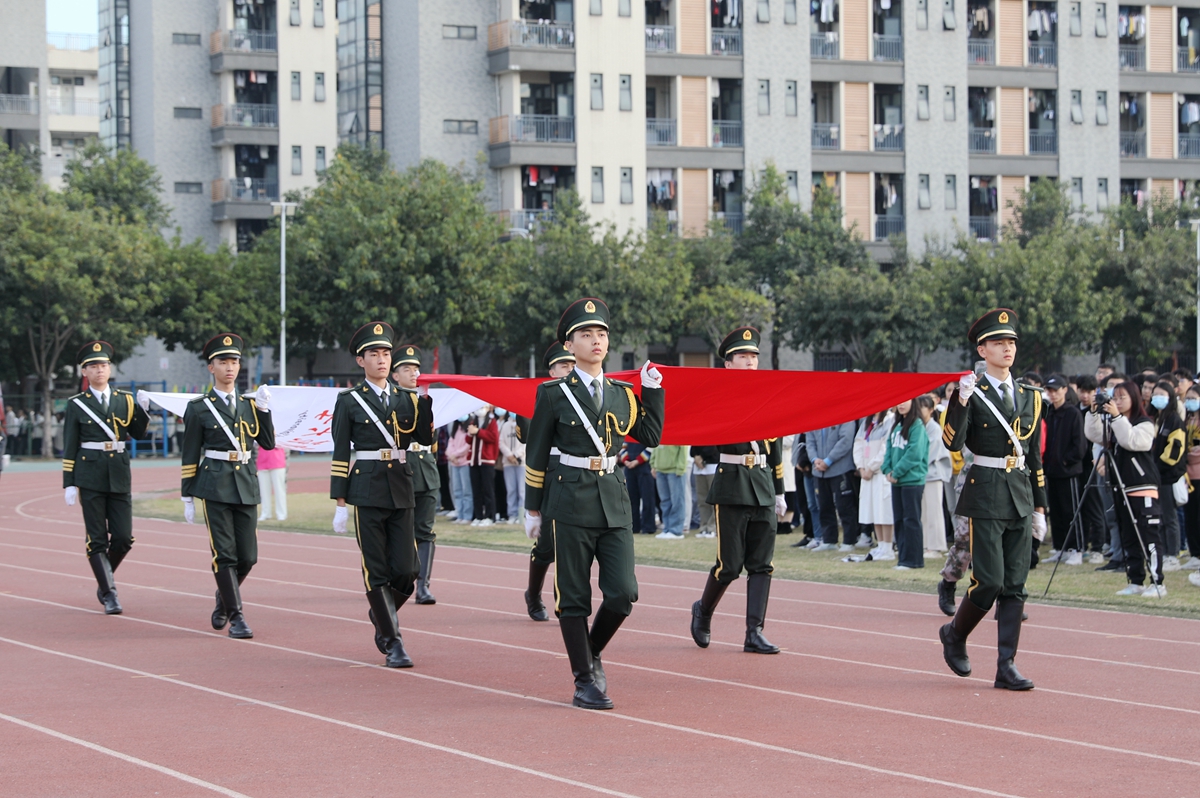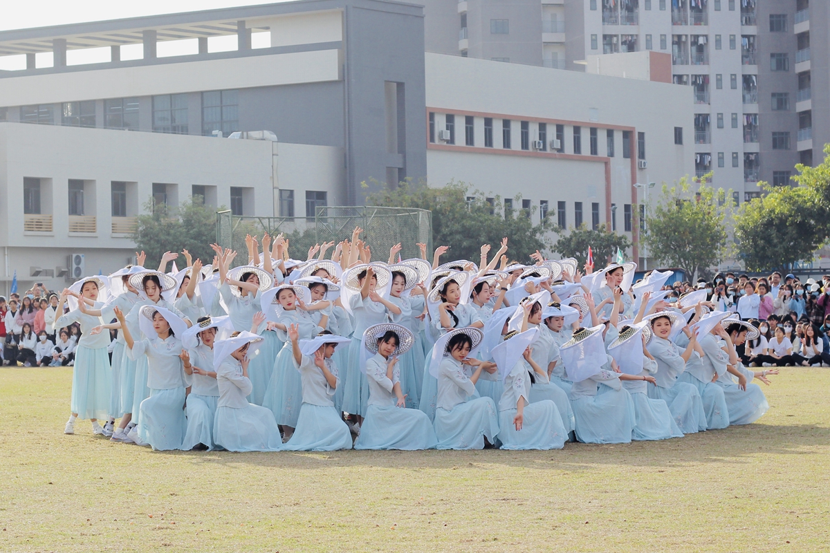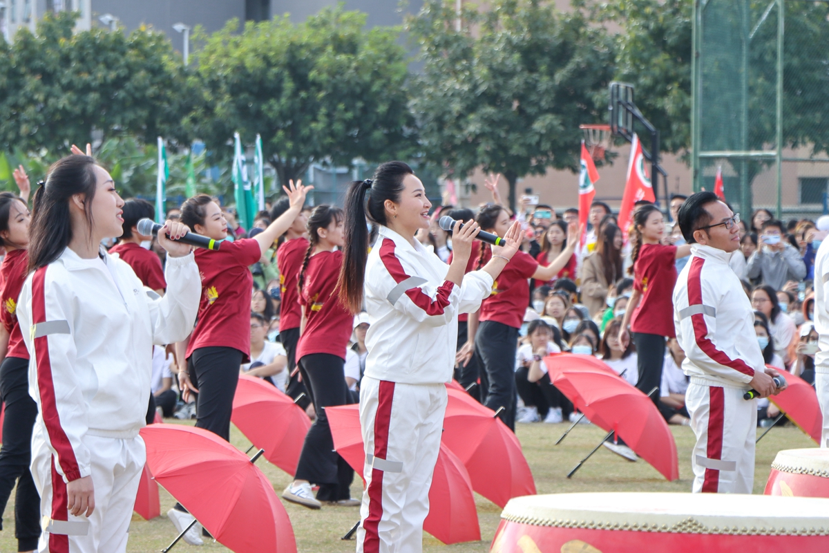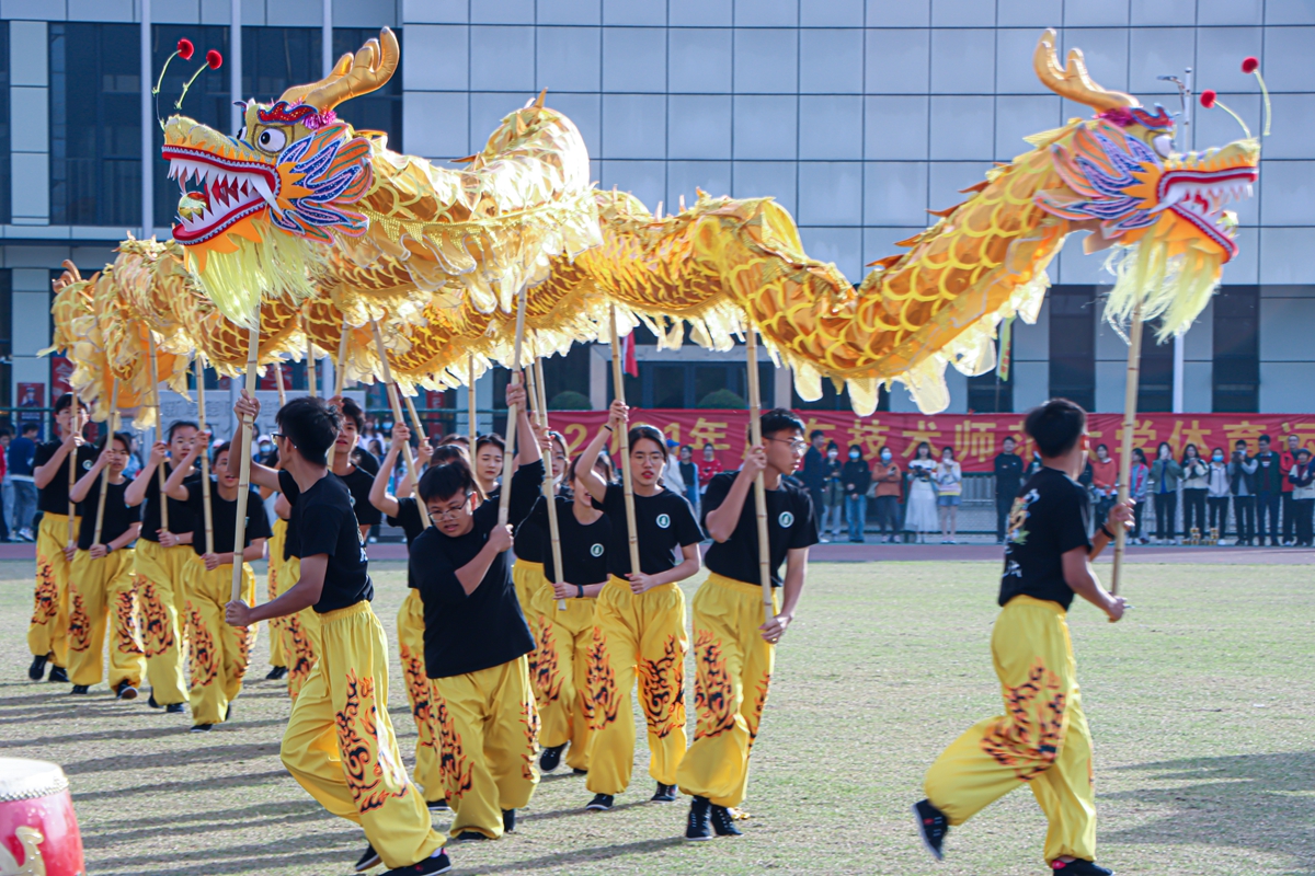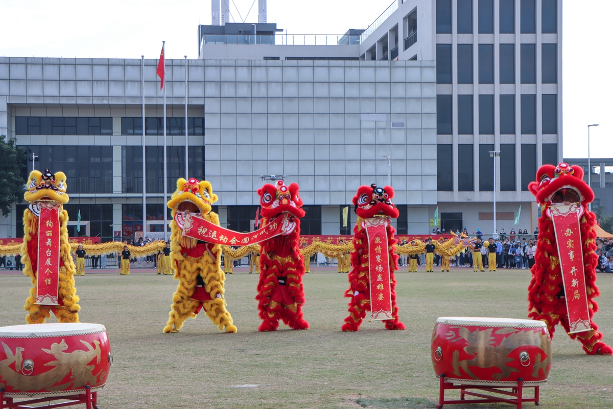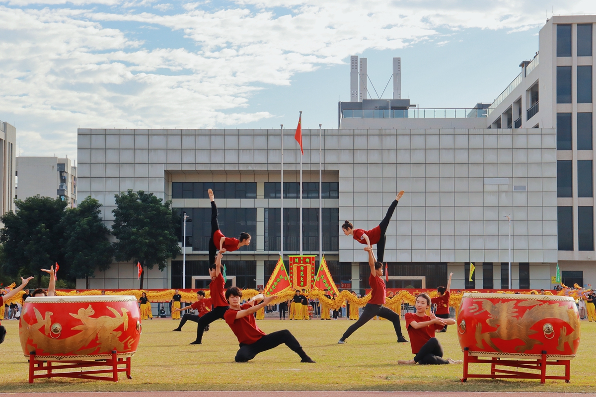 开幕式表演中,铿锵有力、热闹非凡的锣鼓阵阵响起,一条条金色长龙在会场上翻腾起舞, 外形威武、动作刚劲、神态多变的舞狮带来阵阵欢呼,身轻似燕、灵动的舞姿让人陶醉不已,一首激昂的《红旗飘飘》彻底点燃了会场全体师生的热情。
