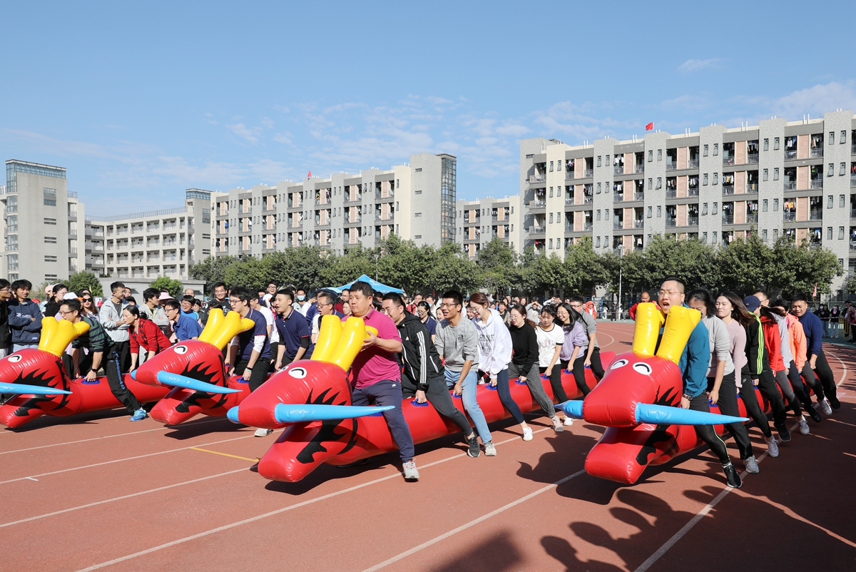 开幕式表演结束后,各项赛事有序进行,697名学生运动员参加了36个项目的角逐。教职工趣味运动会包含“旱地龙舟”“运篮球障碍接力赛”“两人三足射门”“毽球次数赛”等4个趣味项目。运动员挥洒汗水、努力拼搏,用激情与热血诠释自强不息的运动精神;裁判员恪尽职守、公正裁决;观战师生激情呐喊,为赛场健儿加油打气。