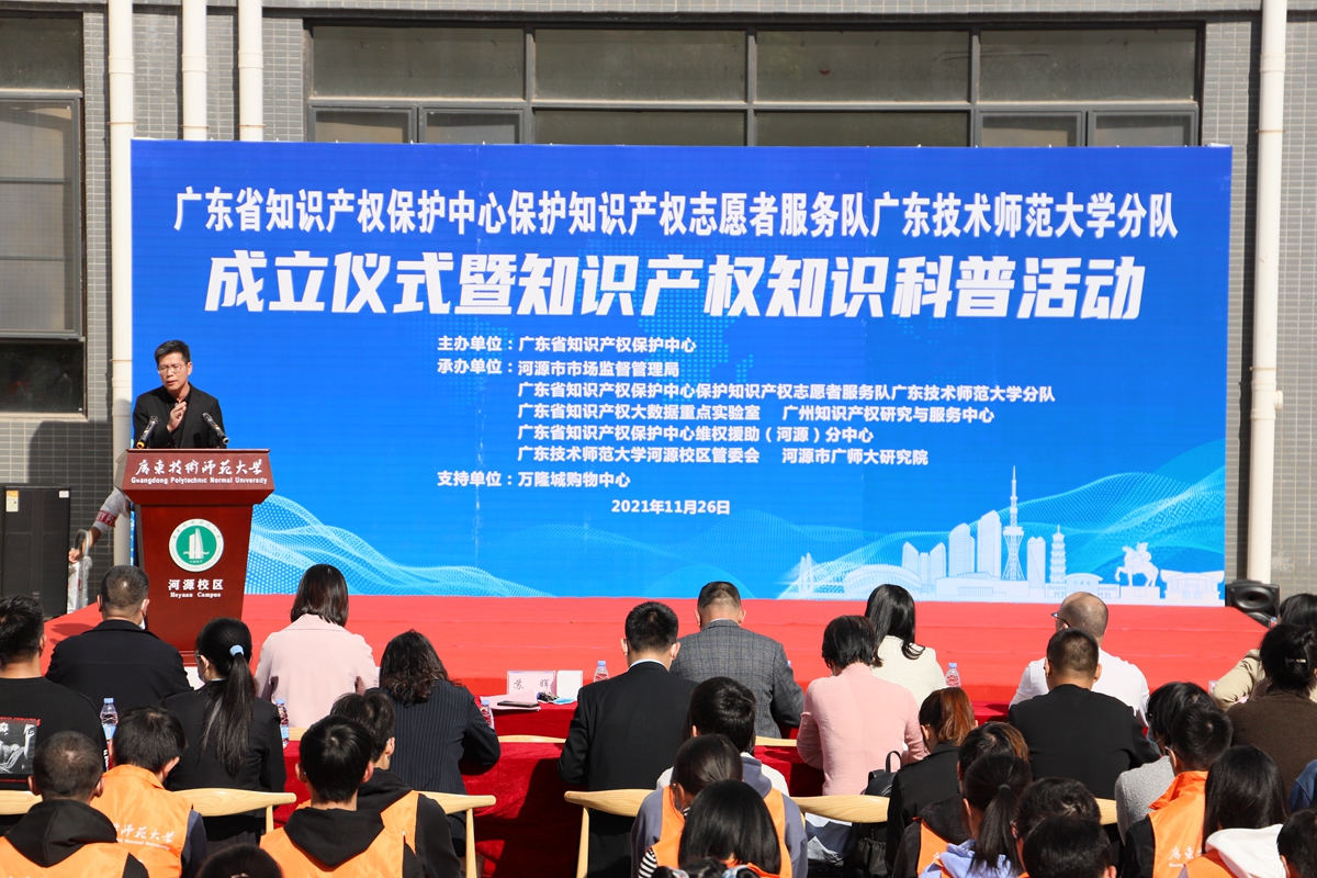 11月26日,由广东省知识产权保护中心主办的“保护知识产权志愿者服务队广东技术师范大学分队成立仪式暨知识产权知识科普活动”在我校河源校区顺利举行。学校副校长苏晖在成立仪式上致辞并为志愿者服务队授旗,河源市市场监督管理局总监伍志勇出席并讲话,广东省知识产权保护中心维权援助(河源)分中心、河源校区管委会等相关单位负责同志及111名志愿者服务队成员参加了本次大会。