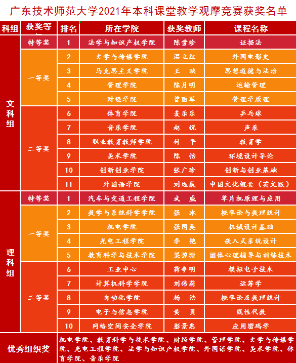 经过激烈角逐,法学与知识产权学院陈雪珍老师、汽车与交通工程学院武威老师分获文科组、理科组特等奖;文学与传媒学院温立红等10位老师分获文科组一、二等奖;数学与系统科学学院张冰老师等9位老师分获理科组一、二等奖;机电学院等11个教学单位获优秀组织奖。