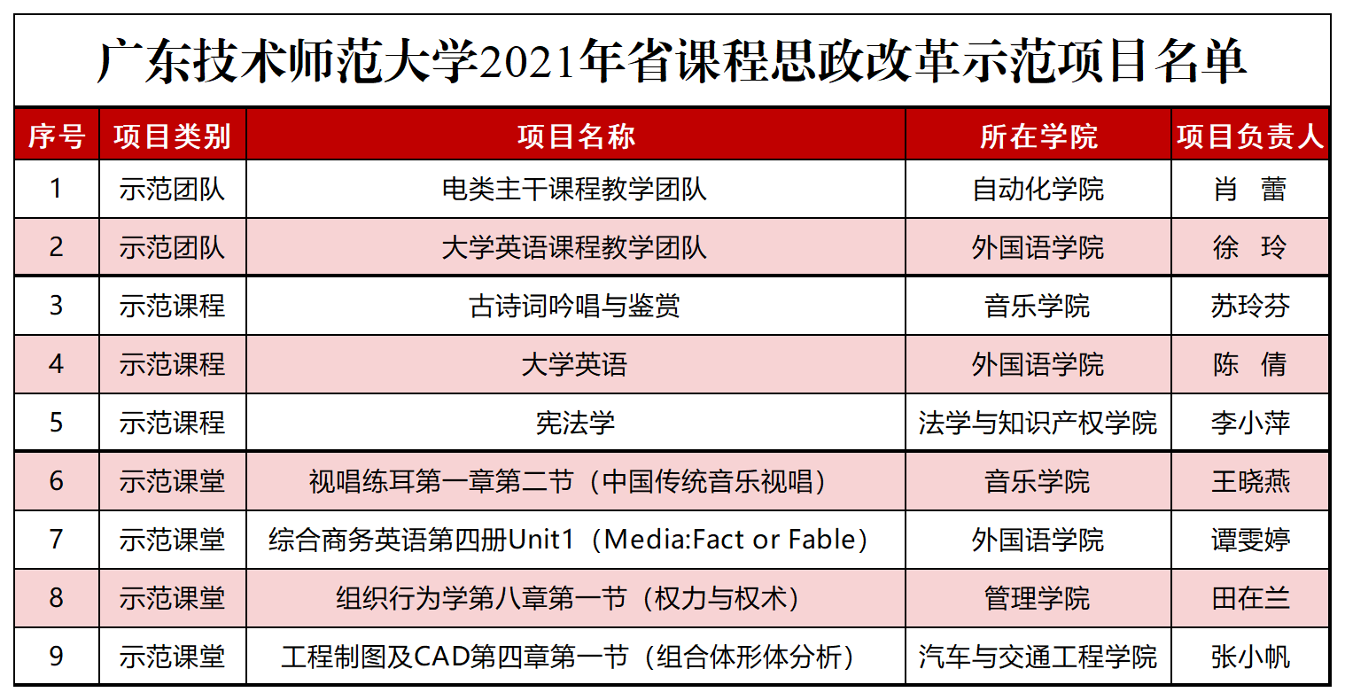 日前,广东省教育厅发布《关于公布2021年度课程思政建设改革示范项目认定结果的通知》(粤高教函〔2021〕21号),我校9个项目获选,其中课程思政示范团队2个、课程思政示范课程3门、课程思政示范课堂4个。