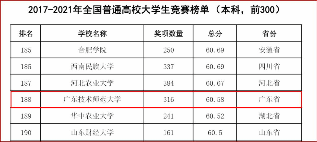 此外,我校还进入了2017-2021年全国普通高校大学生竞赛排行榜单(本科)前300,位居第188位。
