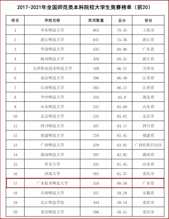2月22日,中国高等教育学会高校竞赛评估与管理体系研究工作组发布2021全国普通高校大学生竞赛分析报告。本次榜单根据获奖贡献、组织贡献和研究贡献等三个方面相关数据进行排行,我校在2017-2021年全国师范类本科院校大学生竞赛排行榜单(本科)排名前20,居第17位。