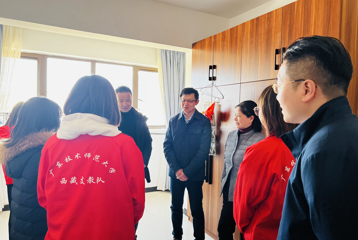 在藏期间,贺勇一行还深入支教队员宿舍开展走访调研,悉心询问支教队员在工作和生活等方面的适应情况,勉励支教队员们要发扬“厚德博学、唯实求新”的校训精神,以坚韧的毅力、细心的思考、大胆的创新、踏实的作风在雪域高原绽放青春之花;接力开展“守望相助”活动(即一名教师党员、一名支教队员,结对认亲林芝职校一名少数民族学生),为结对少数民族学生送上书籍《习近平与大学生朋友们》和学习用品,勉励他们珍惜时光、努力学习,争做新时代高素质技术技能人才、能工巧匠和大国工匠。支教师生们纷纷表示:要珍惜此次支教机会,在实践中锻炼成长,在雪域高原奉献自己的青春力量。