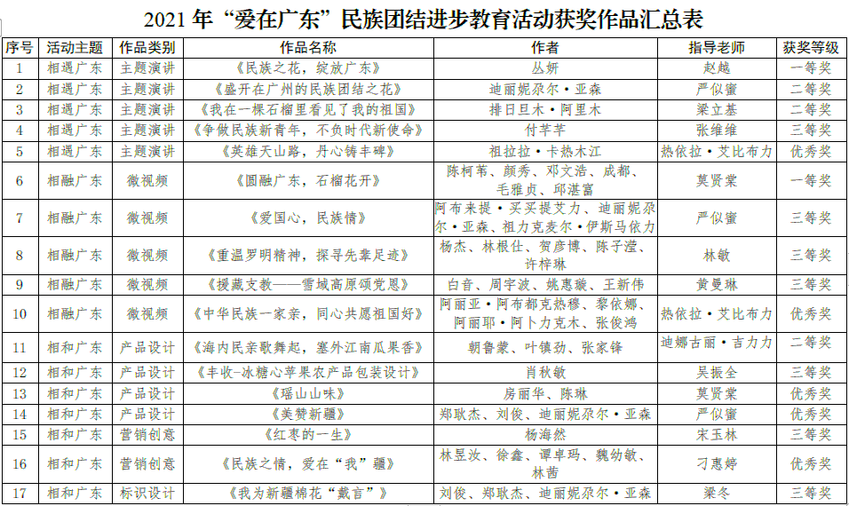 近日,广东省教育厅公布了2021年“爱在广东”民族团结进步教育活动评选结果,我校推选参赛的17项作品分别获得一等奖2项、二等奖3项、三等奖7项、优秀奖5项。