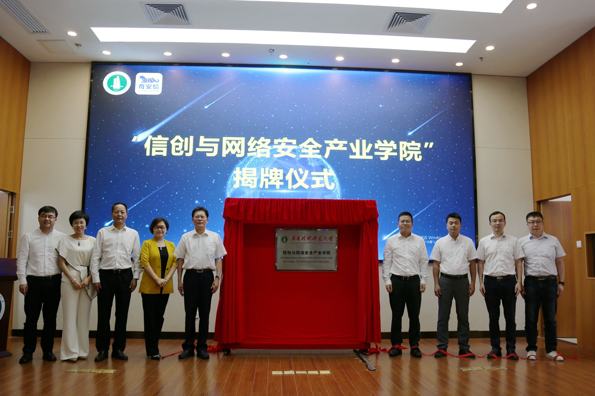 戴青云代表学校对与会嘉宾表示热烈欢迎。她表示,此次活动的举行,是为了落实国家和省相关文件要求,发挥我校“技术+师范”特色优势,构建科产学全方位、全过程、深融合的协同育人长效机制,扎实推进新工科建设再深化、再拓展、再突破、再出发,协调推进新工科与新师范、新文科、服务社会融合发展,为应用型高校建设提供可复制、可推广的广师大新模式。2019年12月,我校与奇安信集团签订战略合作框架协议。两年多来,校企双方积极推动融人才培养、科学研究、技术创新、企业服务、学生创业等功能于一体的示范性人才培养实体建设,共建了网络空间安全学院,打造了产教融合示范基地,共同开创了双方互利、互动、多赢的良好局面。现在,广师大与行业龙头企业联手创建信创与网络安全产业学院,将进一步优化资源共享、实现优势互补,共同探索构建信创与网络安全产业链所需要的中高本硕博层次贯通、产教融合融通的高素质技能型、应用型人才培养体系。奇安信集团带着满满的诚意,为学校捐赠价值120万元的网络安全攻防实验平台,双方共建“广师大—网络安全攻防实验室”,这是校企深度融合,也是产业学院成立后的落地成果之一。