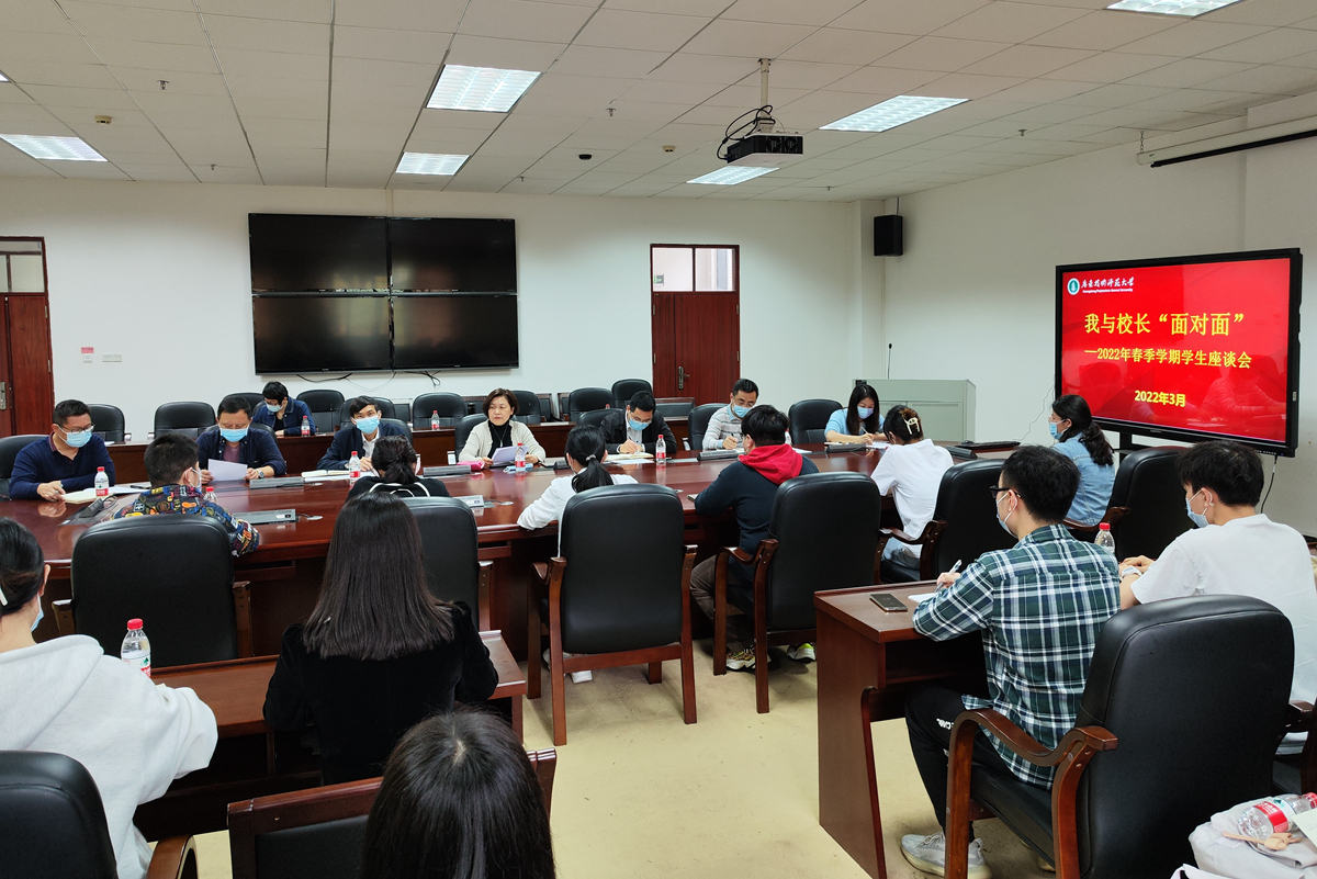 近日,我校2022年春季学期“我与校长面对面”座谈会在白云校区1教234会议室召开。校长戴青云,校办、研究生院、学生处、后勤处、安保处等职能部门负责人和白云校区各学院20余名学生代表参加了座谈会。座谈会由校办负责人主持。