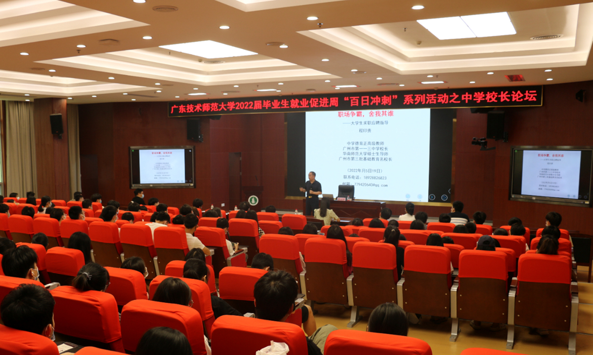 为进一步贯彻落实党中央、国务院“稳就业”“保就业”决策部署,抢抓高校毕业生求职关键期,根据我校2022届毕业生就业促进周开展“百日冲刺”系列活动相关安排,5月19日,学校邀请了广州市第一一三中学校长程印贵来校作专题讲座。主会场设在东校区讲学厅,白云校区和河源校区设分会场同步直播,共1000余名学生参加。