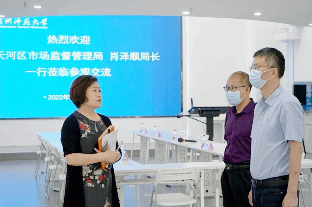 6月28日,天河区市场监督管理局肖泽顺局长一行莅临我校广东省知识产权大数据重点实验室进行参观并举行座谈会。我校校长戴青云出席座谈会介绍实验室的概况。出席本次座谈会的还有天河区市场监督管理局二级高级主办柯杰兵,促进科科长邱美莲和随行人员,我校科研处、广东省知识产权大数据重点实验室、工业中心相关负责人参加座谈会。