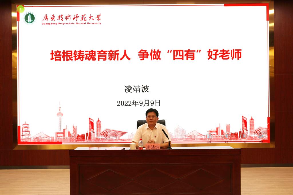 凌靖波书记强调,我校历来高度重视师资队伍建设和师德师风建设,着力涵养优良师德师风,培养造就具有坚定理想信念、深厚爱国情怀、高尚师德师风、极具创新能力的一流教师队伍。结合学校开展的师德建设主题教育月活动,凌靖波书记提了四点要求:一要坚持守正创新、潜心立德树人,做学生成长成才的“引路人”;二要赓续红色血脉、继承优良传统,做广师大精神的“传承者”;三要弘扬高尚师德、勇担育人使命,做青年学子思想的“系扣人”;四要坚持培根铸魂、塑造学生品格,做教书育人的“大先生”。希望老师们牢记“为党育人、为国育才”的初心和使命,做到明道信道、为人师表、业精善学、敬业爱生,在广师大这片广阔天地里施展才华、放飞理想,在推动中国特色世界水平技术师范大学建设的实践中增长才干、建功立业。