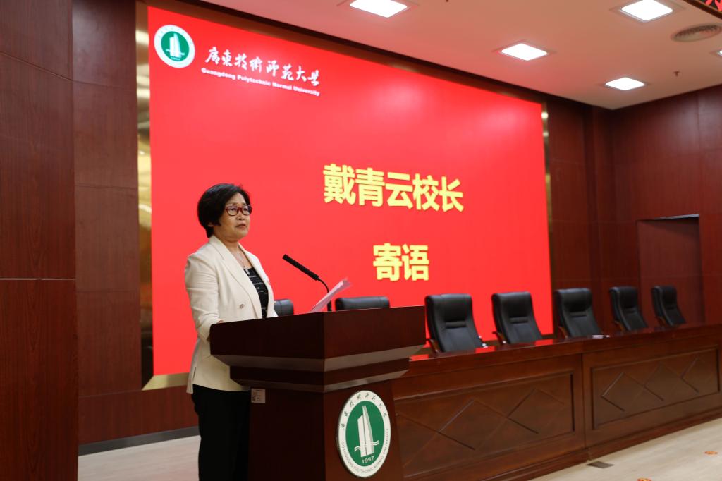 戴青云校长作了题为《培根·铸魂·强师》的讲话。她代表学校向新入职教师和辛勤工作在教学、科研、管理和服务一线的广师大全体教职工致以节日的祝福和衷心的感谢!并向大家简要介绍了学校的发展历程,特别是更名大学以来学校各项事业的快速发展。她表示,新教师的加入进一步壮大了学校教师队伍,助力学校办学综合实力、影响力不断提升。戴青云校长鼓励新入职教师尽快转变身份,适应新的环境变化,迅速投入到新的工作岗位,并提了三点希望。一要身正为范,以德为先,用坚定的理想信念、先进的教学理念做好传道、授业、解惑,以人格魅力引导学生心灵,以学术造诣启发学生智慧。二要技高为师,以技立身,在教学岗位站好三尺讲台,讲好每一门课,努力做到从“上得了讲台”到“站得稳讲台”再到“创造最美讲台”。在学生工作和管理岗位,则要以服务的技术和管理的艺术,关心关爱学生成长,支持服务好教师发展。三要紧跟时代,不断创新,主动对接粤港澳大湾区建设、新型举国体制突破核心关键技术等重大发展战略,加强学习、抢抓机遇、大胆创新,在广师大的舞台上大放异彩。
