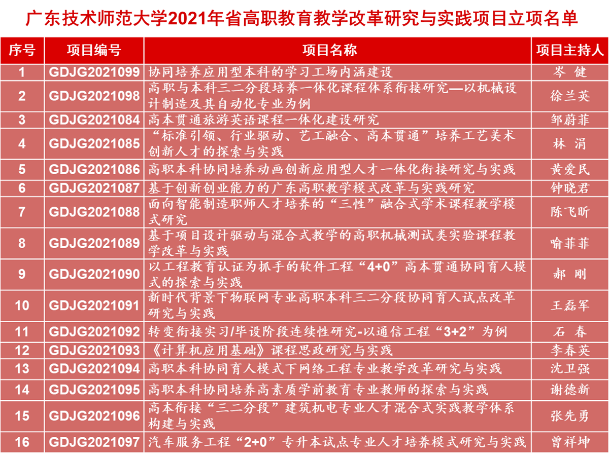 近日,广东省教育厅下发《关于公布2021年省高等职业教育教学质量与教学改革工程项目立项名单的通知》(粤教职函〔2022〕23号),我校《协同培养应用型本科的学习工场内涵建设》等16个项目获批为省高职教育教学改革研究与实践立项项目。