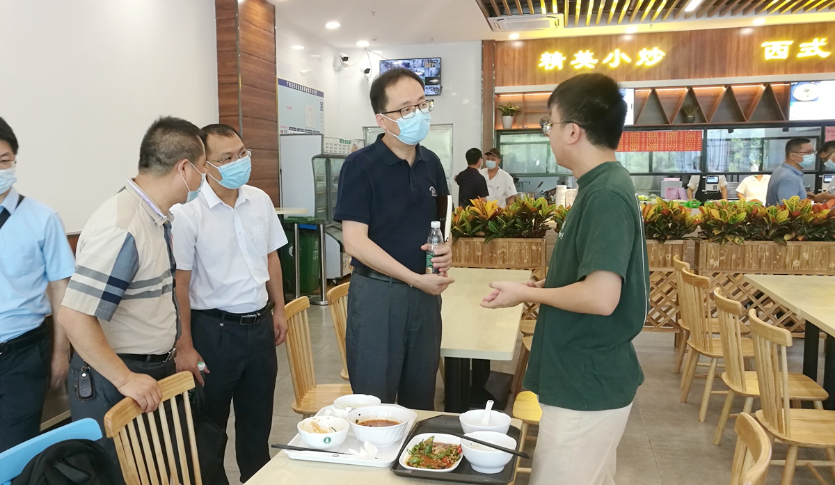 孙燕青副校长一行先后实地检查白云校区西门、东南门疫情防控工作;深入临建棚AB栋、大咖广场、第一实训楼等楼宇、实验室,仔细查看消防设施安全、实验室安全用电、规范化管理等情况;深入第一、三饭堂后厨、冷库等,检查食堂食品安全卫生和安全用气情况,并现场与用餐学生交流,听取他们对食堂安全卫生、饭菜质量等情况意见。
