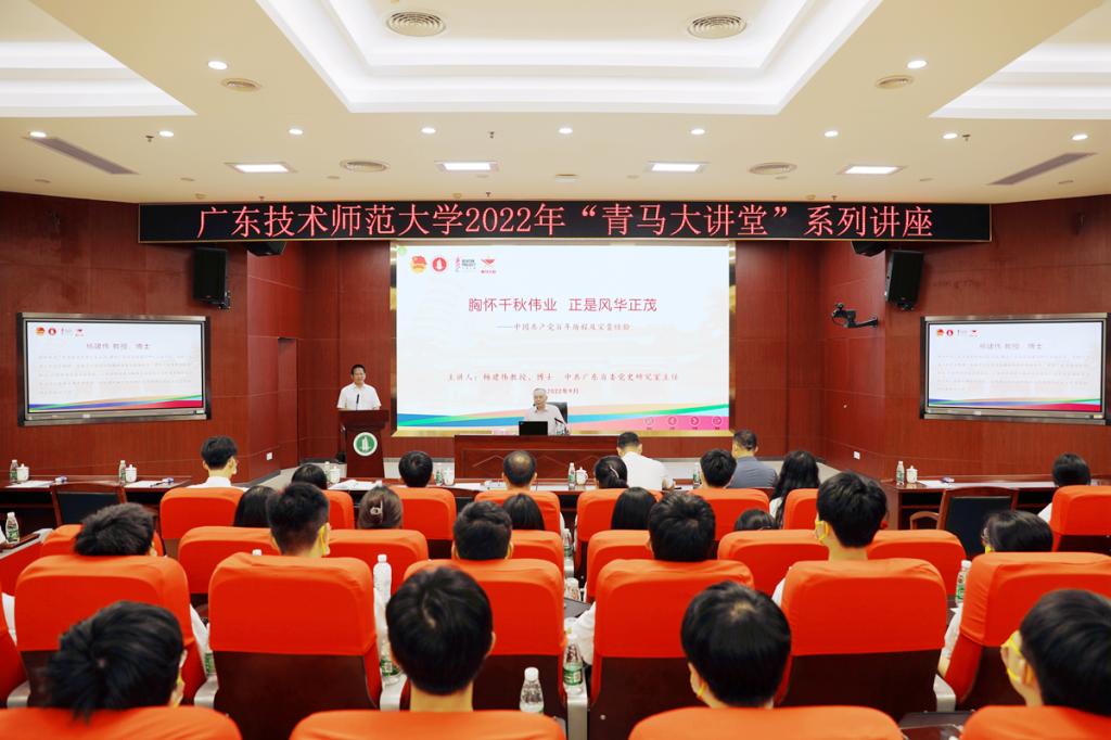 9月22日, 由校团委主办的“青马大讲堂”系列讲座在东校区一教208顺利举办,广东省委党史研究室主任杨建伟教授应邀为我校“青马工程”学员作题为《胸怀千秋伟业 正是风华正茂——中国共产党百年历程及宝贵经验》专题讲座。讲座由学校党委副书记李向明主持。校团委、马克思主义学院相关负责同志、二级学院团委书记及校院两级青马学员参加讲座。