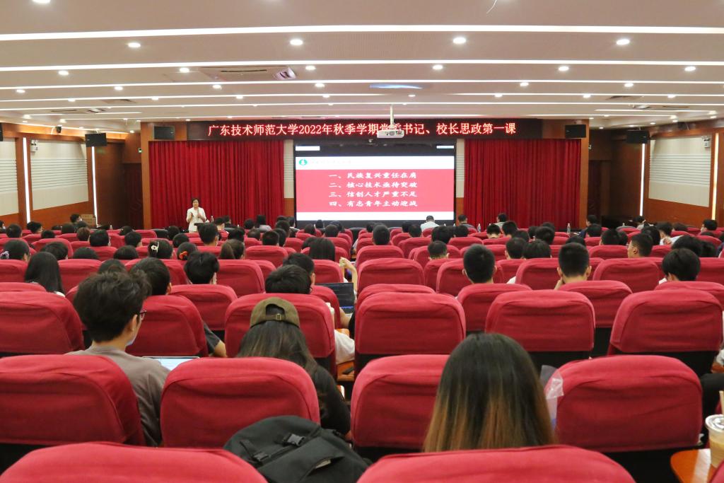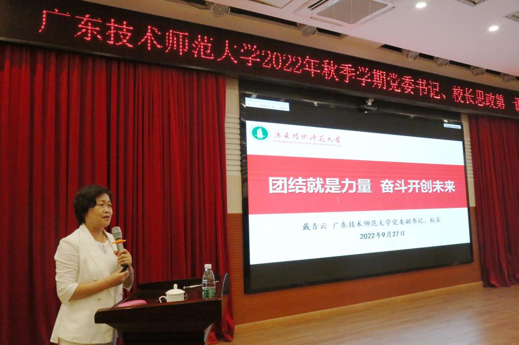 9月27日,戴青云校长在白云校区为理工类的师生讲授本学期“思政第一课”。她以“团结就是力量 奋斗开创未来”为题,结合个人学习《习近平谈治国理政》第四卷的体悟感想,分别从民族复兴重任在肩、核心技术亟待突破、信创人才严重不足、有志青年主动迎战等四个部分进行系统阐述,勉励全体同学要深刻把握国家和世界发展大势,自觉锤炼对党忠诚的政治品格,树立正确价值观、人生观,努力成为担民族复兴大任的时代新人。党委宣传部、学生工作部、团委、部分学院负责人和辅导员、师生代表等200多人聆听授课。