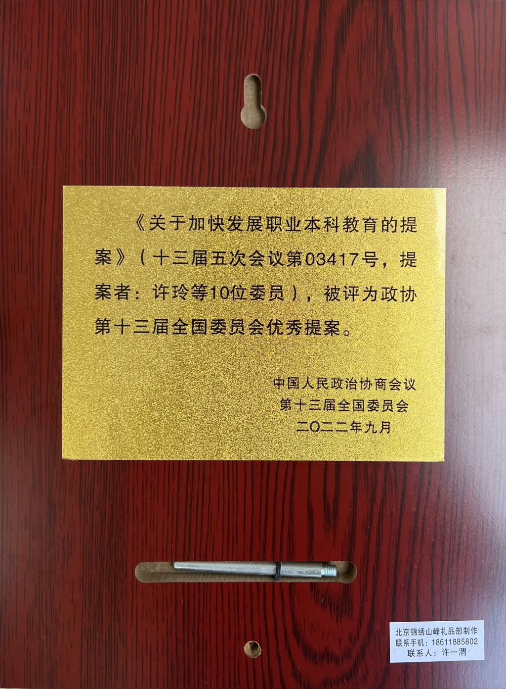 9月20日,政协第十三届全国委员会优秀提案和先进承办单位表彰会在北京召开,会议表彰了248件优秀提案和46家先进承办单位。全国政协委员、民建广东省委会副主委、我校副校长许玲在十三届五次会议上提交的《关于加快发展职业本科教育的提案》获得优秀提案表彰。