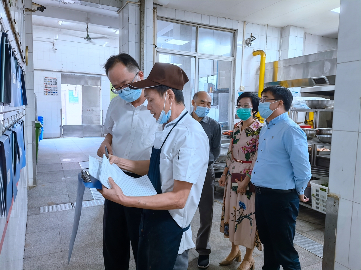 孙燕青副校长一行先后检查校区大门口、观察室,了解人员、车辆入校信息核查、登记等方面的防疫要求落实,以及观察室设置、住宿条件、物资配备、送餐安排等情况。深入检查饭堂,了解饭菜供应、食品安全、环境卫生、工作人员每日晨检登记等情况。