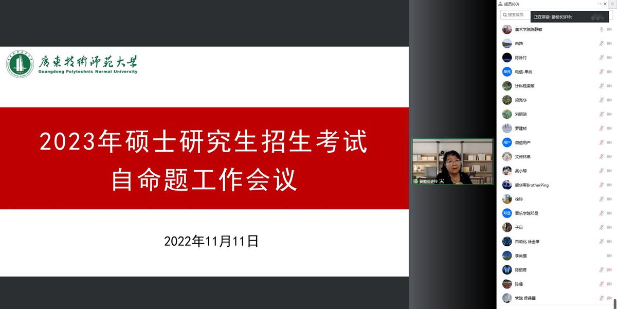 11月11日,我校2023年硕士研究生招生考试自命题工作会议通过线上的形式召开。学校副校长许玲出席会议并讲话。研究生院党政负责人、纪检监察室负责人,各研究生招生单位院长、分管研究生招生工作副院长、负责研究生招生工作秘书及研究生招生办公室全体人员参加会议。