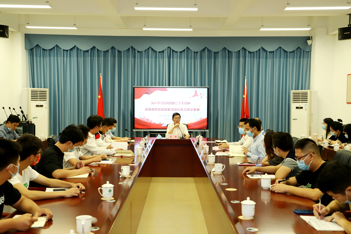 会上,苏晖副校长介绍了党的二十大的基本情况和重要成果,从理论维度和实践维度分享了学习党的二十大精神的心得体会,深入剖析了“办好人民满意教育”中的历史使命、“加快实施创新发展战略”中的深化改革、“坚持全面依法治国”中的依法治校、“建设堪当民族复兴重任的高素质干部队伍”中的能力作风提升、“不负时代,不负人民”中的创业精神五个方面的内容,并结合河源校区实际勉励全体校区师生员工深入学习贯彻党的二十大精神,深刻领悟精髓助推河源校区高质量发展。