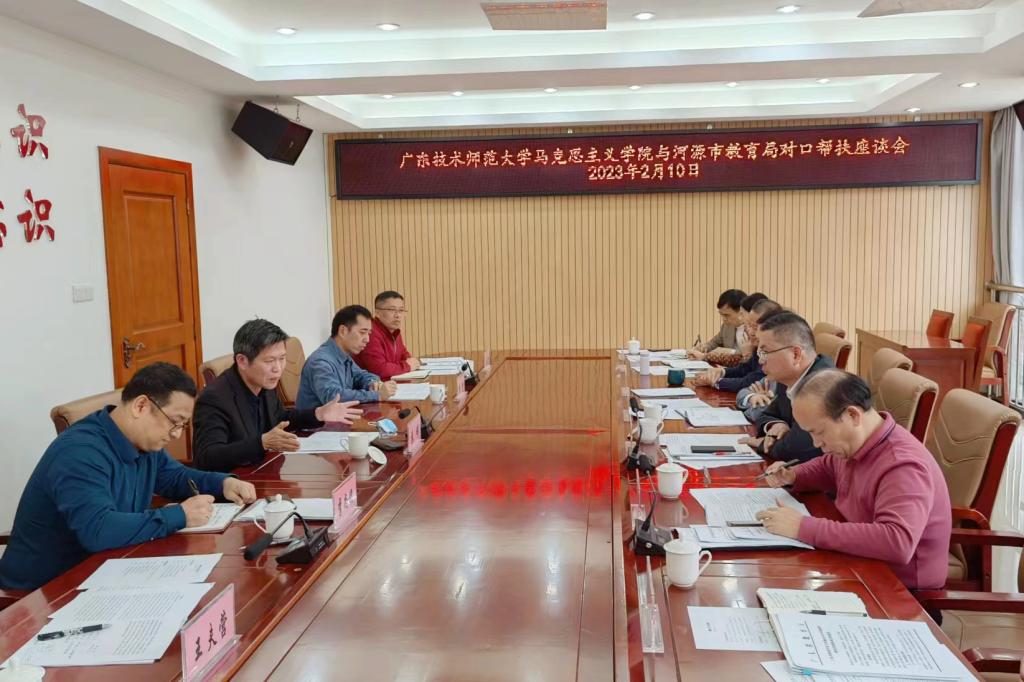 为贯彻落实教育部和广东省教育厅的有关通知要求,切实发挥思政课立德树人关键课程作用,全面增强思政育人效果,2月10日,学校副校长苏晖带领我校马克思主义学院、河源校区等部门负责人和相关工作人员前往河源市教育局洽谈大中小学思政课一体化共建事宜。河源市教育局副局长张金坤、二级调研员陈俊荡以及各科室负责人等参加了座谈活动。