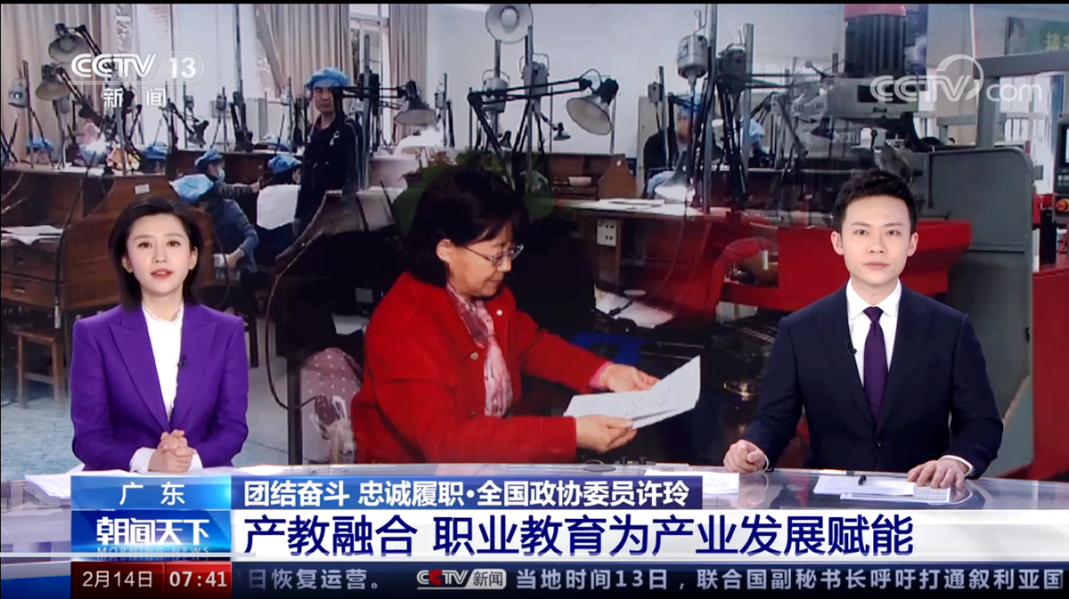 2月14日晚,央视晚上七点《新闻联播》和早间《朝闻天下》播发全国政协委员、民建广东省委会副主委、学校副校长许玲:深化产教融合 优化技能人才教育。