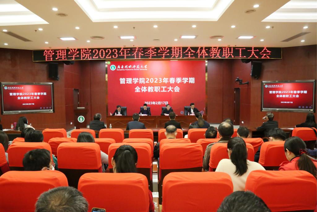 2月17日,管理学院在东校区一教208讲学厅召开2023年春季学期全体教职工大会。学校副校长苏晖出席会议并讲话,党委组织部副部长李峰、管理学院党政班子成员、全体教职工参加会议。