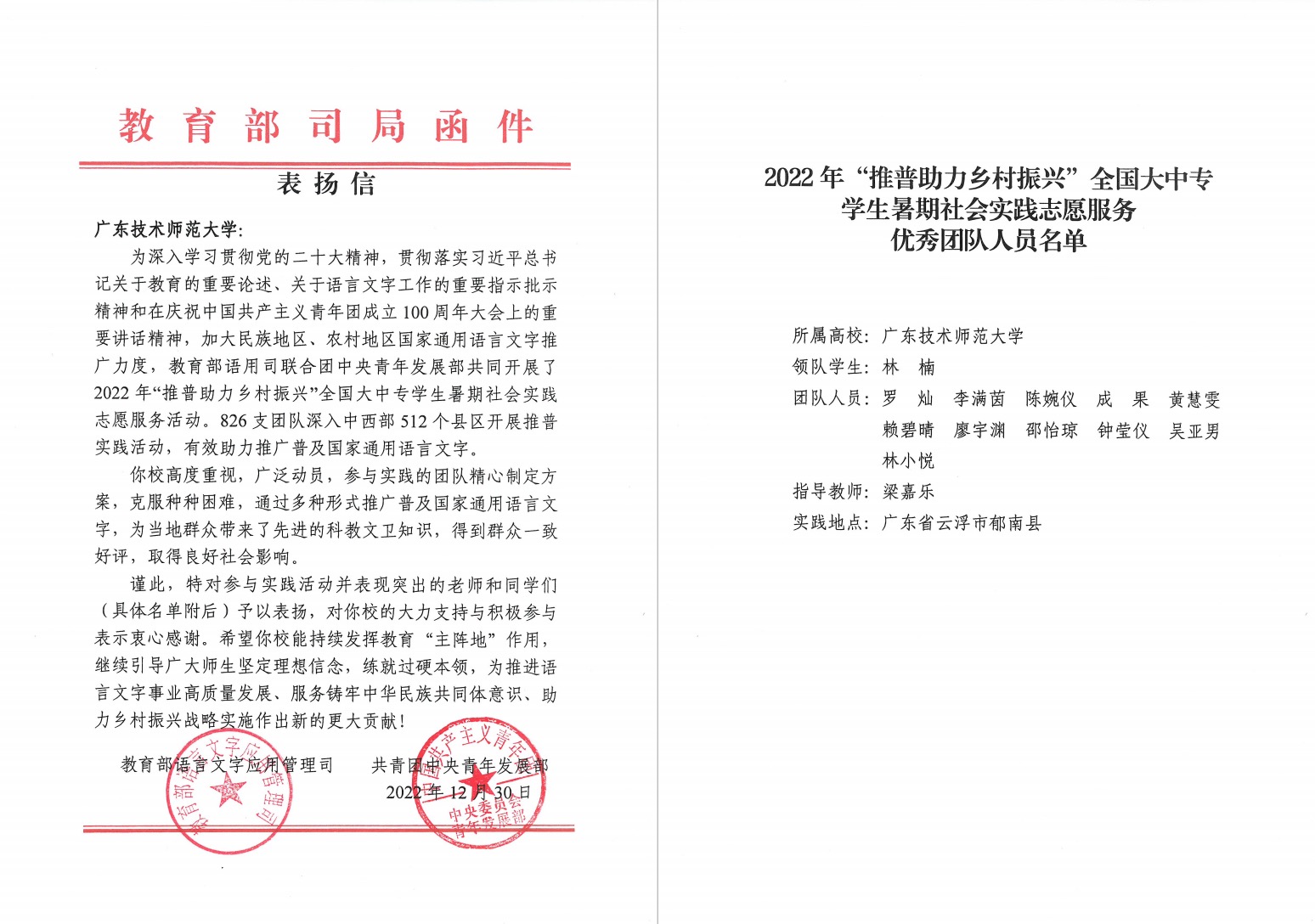 近日,2022年“推普助力乡村振兴”全国大中专学生暑期社会实践志愿服务活动优秀团队名单公布,我校法学与知识产权学院实践团队(团队成员:林楠等;指导老师:梁嘉乐)获评优秀。教育部语言文字应用管理司、共青团中央青年发展部联合向我校发来表扬信,对我校参与实践活动并表现突出的老师和同学们予以表扬,对我校的大力支持与积极参与表示衷心感谢。