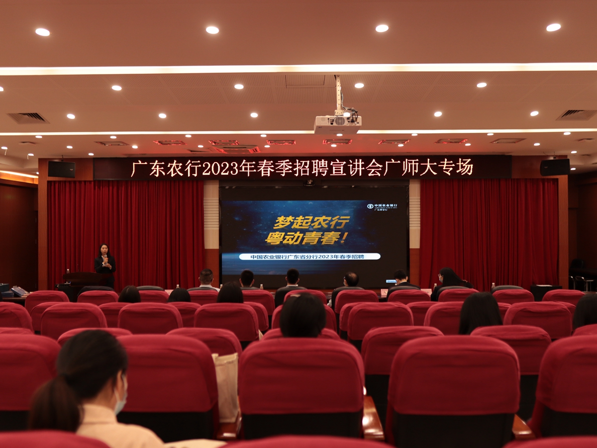 广州分行高级人力资源曹庭恺全方位解读广东农行的企业文化、培养计划、晋升体系、薪酬福利及春招安排,他表示广师大是广东农行“梦起农行 粤动青春”春季招聘专场的首站,广东农行有不少广师大的优秀校友和人才,希望以此契机实现广东农行与广师大毕业学子的双向奔赴。从化支行综合部副经理叶梓毅以“广交友,乐升活”为主题对农行从化支行进行专题招聘宣讲。在答疑环节,农行招聘团队一一回答现场与会同学们关于系统简历筛选、实习生招聘、岗位地区分配、新人帮扶机制等问题。会后,广东农行招聘团队对应聘学生有序地进行了现场面试。
