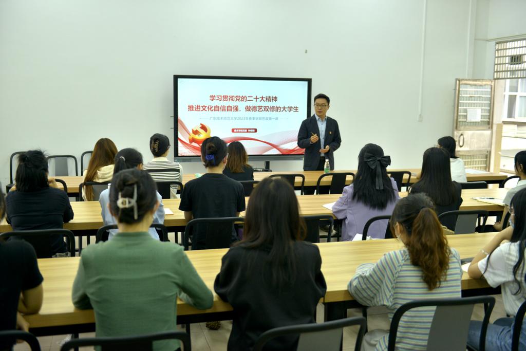 学院党委书记钟健雄以《学习贯彻党的二十大精神,推进文化自信自强,做德艺双修的大学生》为题,为美术学院2019级和2020级的学生讲授了一堂内容丰富的思政课。他从“完整准确全面理解把握党的二十大精神”“学习领会习近平总书记关于文艺工作的重要论述”“扛牢新时代文化自信自强的责任与担当”三方面,深度分析了作为美院学子应该如何立足文化自信自强成为德艺双修的新时代青年。结合专业实际,他还分享了学院历届优秀毕业生代表的先进事迹,勉励同学们要始终心怀祖国,探索逐梦大学的意义;不负韶华,做好青春赛道的规划;寻找身边的“职”路人,成为德艺双修的优秀大学生,为推动学院和学校事业的高质量发展贡献力量。