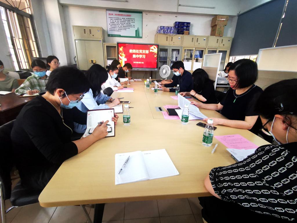 会上,杜灿谊同志传达了学校党委书记凌靖波在学校学习贯彻习近平新时代中国特色社会主义思想主题教育动员部署会上的讲话精神。接下来,教务处党支部委员会将根据学校党委制定的《关于深入开展学习贯彻习近平新时代中国特色社会主义思想主题教育的实施方案》,结合学校“做强新工科、做特新师范、做优新文科、做大国际合作与社会服务”的发展思路,对支部主题教育工作进行部署,五个党小组将传承并发扬教务处党支部“每日一学”的优良作风,将主题教育工作落到实处。