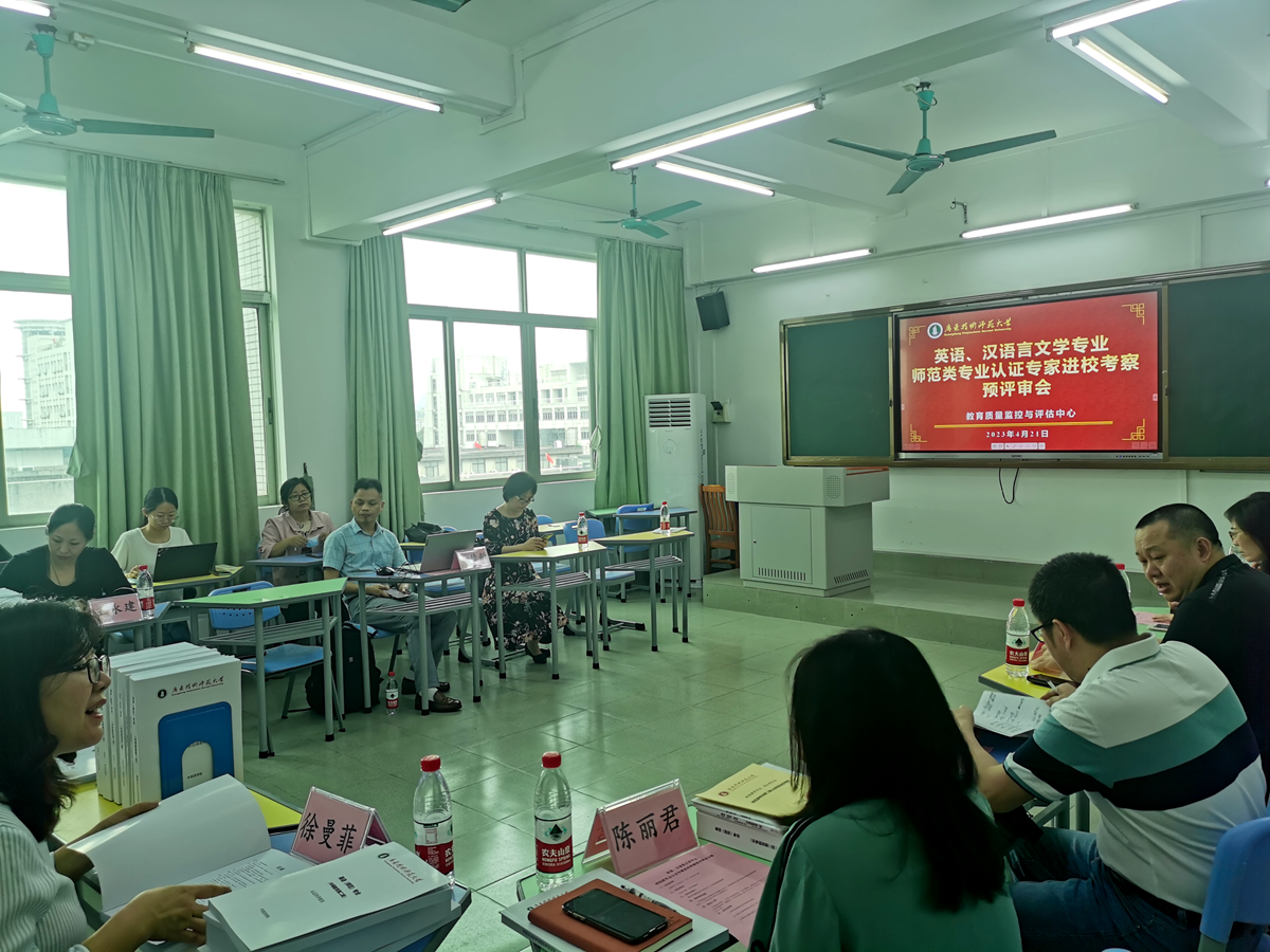 为进一步推进我校英语、汉语言文学师范类专业认证工作,检查两个专业认证准备工作情况,查找两个专业在师范类专业评建工作中存在的问题和短板,4月21日下午,教育质量监控与评估中心邀请华南师范大学教务处处长熊建文、华南师范大学外国语学院副院长徐曼菲、广州大学文学院副院长马喆作为评审专家对英语、汉语文文学专业师范类专业认证材料进行预评审工作。