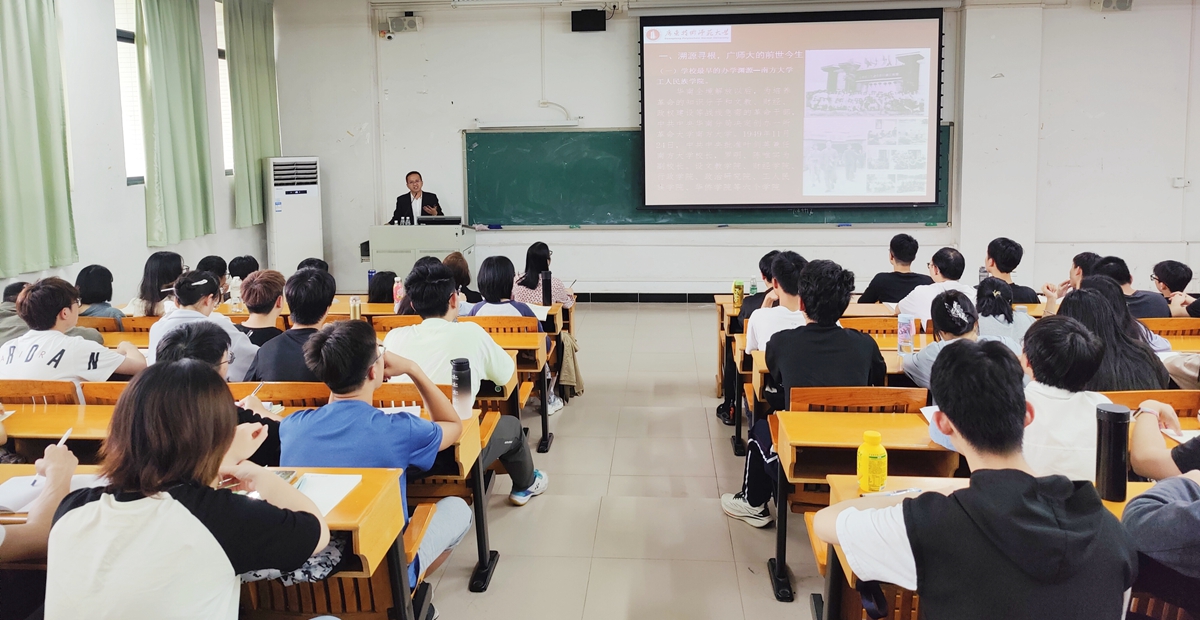 韩柏光以《赓续红色血脉争当时代新人——从校史的红色基因汲取奋进的智慧和力量》为题,从“溯源寻根,广师大的前世今生”“两度搬迁又停办复办,特定年代的艰难守望”“三次更名与一校五址,广师大的华丽转身”“广师大的红色记忆与青年大学生的使命担当”四个方面为在场同学全面系统地讲述了我校的发展历程。他指出,学校创办66年来,一路风雨兼程,取得今天的办学成就离不开一代又一代先辈们筚路蓝缕、手胼足胝的奋斗,他们秉持着“捧着一颗心来,不带半根草去”的奉献精神,矢志不渝为学校的创建和发展贡献力量。学校的发展史蕴含着鲜明的红色基因,希望同学们珍惜大学时光,坚定人生航向,传承红色基因,赓续红色血脉,争当新时代追梦人。