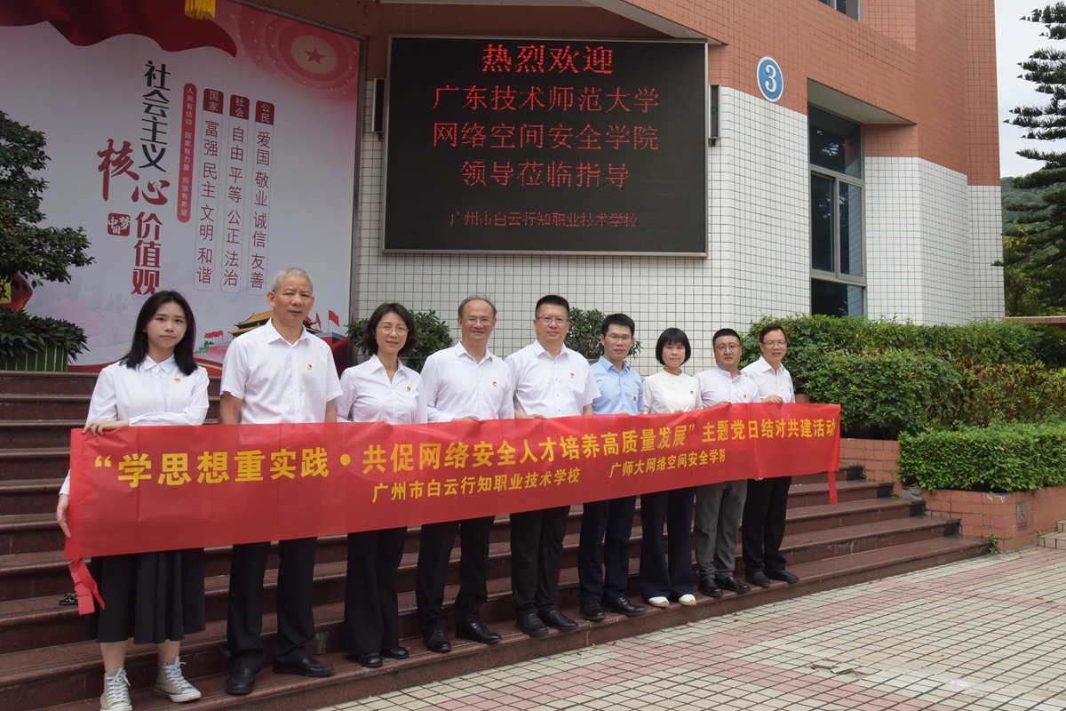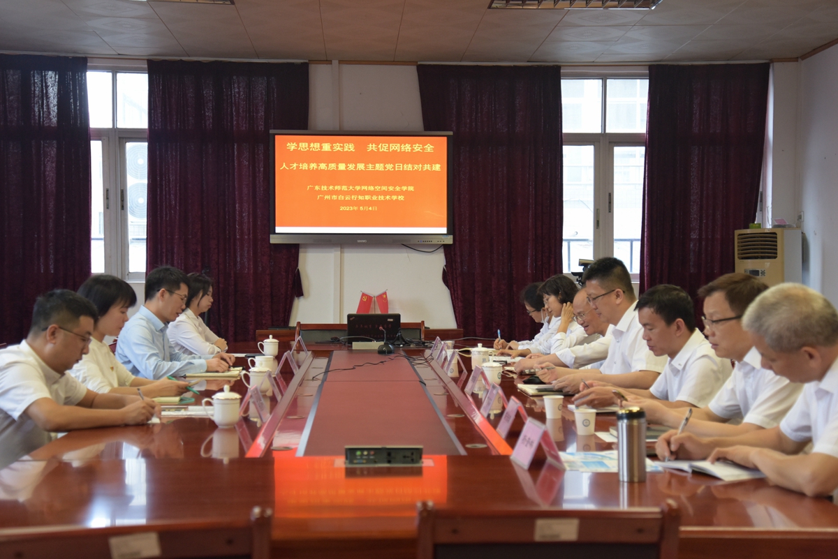 为进一步推动学习贯彻习近平新时代中国特色社会主义思想主题教育走深走实,贯彻落实党中央、国务院“稳就业”“保就业”决策部署,推进学院教育实习基地建设,提升师范类专业人才培养质量,5月4日,网络空间安全学院副院长罗建桢、教工党支部书记陈桂宏一行赴广州市白云行知职业技术学校开展实习洽谈暨“学思想重实践•共促网络安全人才培养高质量发展”主题党日活动。广州市白云行知职业技术学校党总支书记伍广溪、校长白建强、副校长梁慧勤及学校办公室、学生科、教务科等相关负责人参加了此次活动。