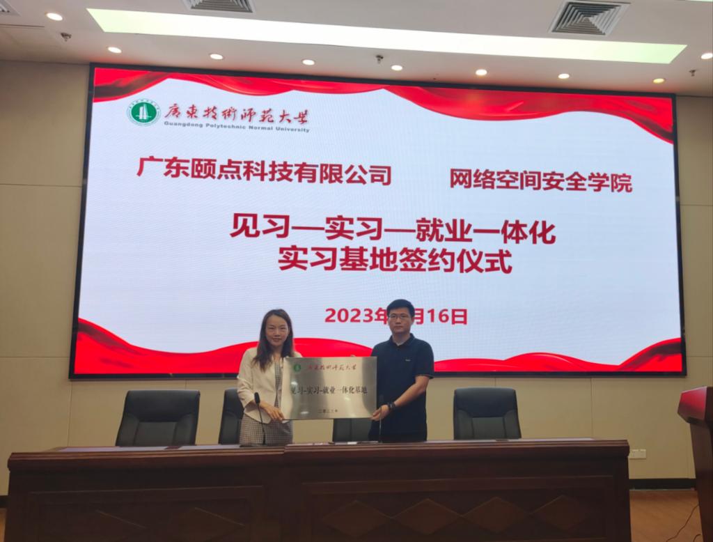 为进一步推动学习贯彻习近平新时代中国特色社会主义思想主题教育走深走实,贯彻落实党的二十大精神,深入调查研究,积极搭建校企产学研合作交流平台,提升大学生实践能力,5月16日,网络空间安全学院与广东颐点科技有限公司在西校区实训楼大礼堂签署了“见习-实习-就业一体化基地”建设协议,并举办了网络安全专场招聘宣讲会。广东颐点科技有限公司总经理刘炜胜、副总经理江鸿生、技术经理林杰、人事经理刘雅婕,网络空间安全学院党委副书记肖茵茵出席签约授牌仪式和就业宣讲活动。
