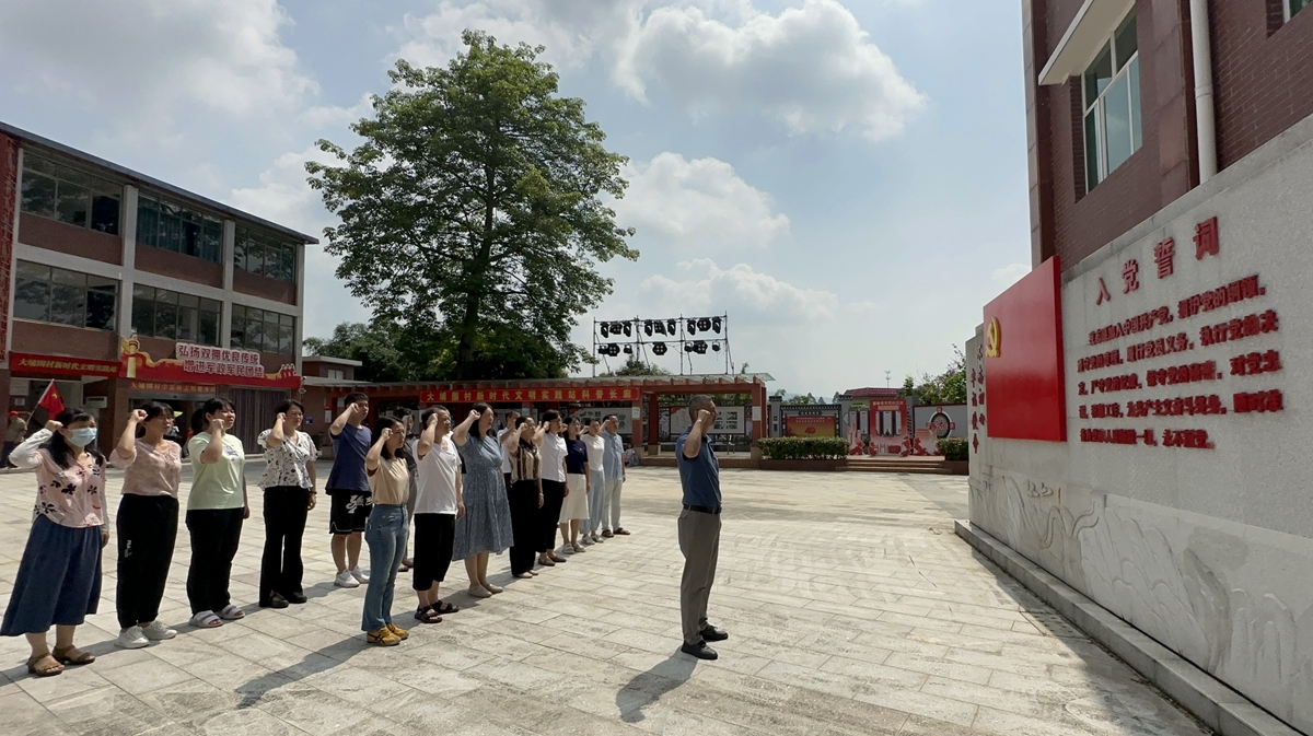 大埔围村位于广州市增城区增江街东部,是东江纵队抗日游击根据地之一。基地入党誓词墙前,参加活动的全体党员面对党旗庄严肃立,纪检监察室副主任许昌林作为领誓人,带领大家高举右拳,一同重温入党誓词,表达广大党员教师对党的无限忠诚与热爱。