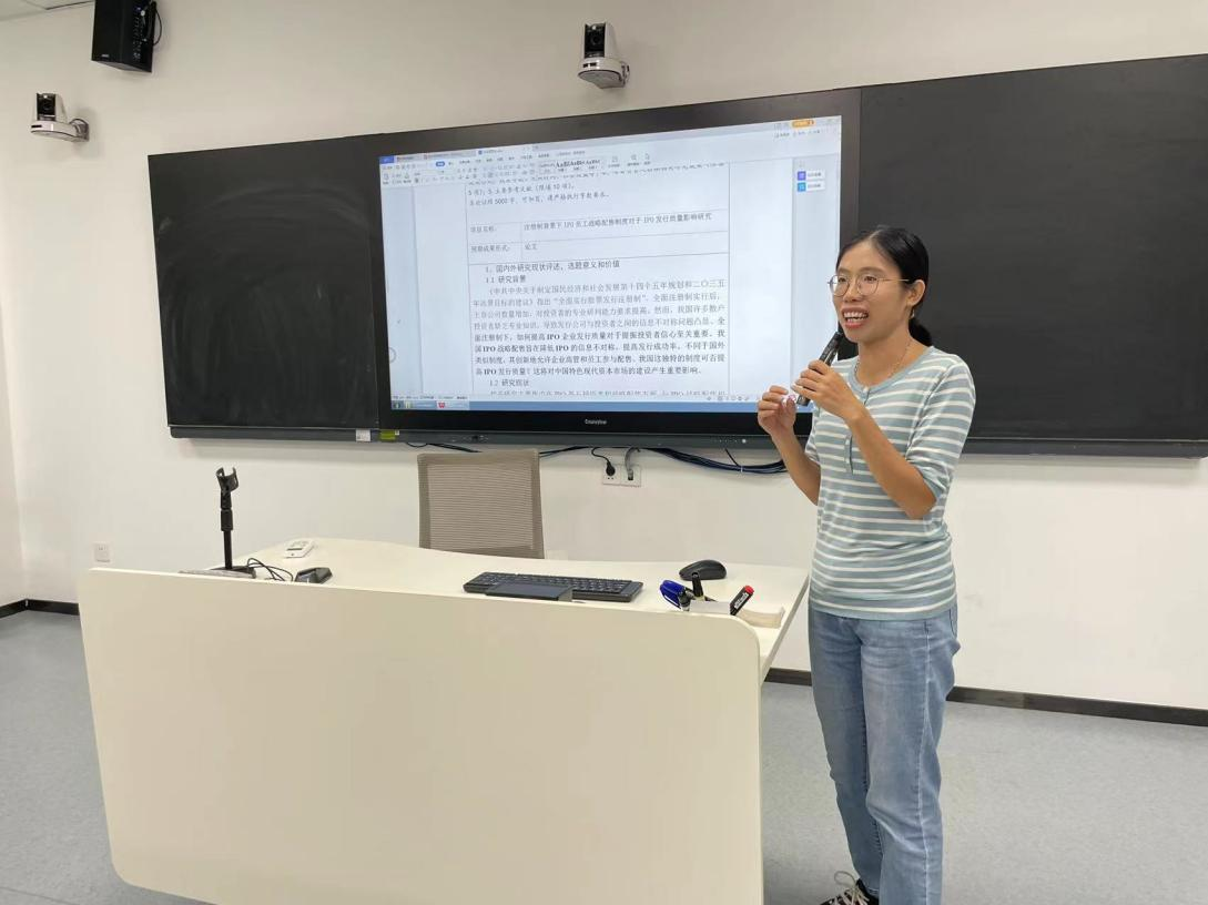 曾诗韵博士的主讲题目为《注册制背景下IPO员工战略配售制度对于IPO发行质量影响研究》,她从国自科项目申报书的修改过程中详细阐述了申报书的多个方面的核心观点,包括IPO员工战略配售实施动机识别和度量、影响机制、制度完善建议等,分析了申报中的重难点。多位我院老师积极参与讨论,并给出包括题目范围、IPO发行质量、政策背景监管环境、公司筛选等方面申报建议,老师们进行了热烈的讨论。