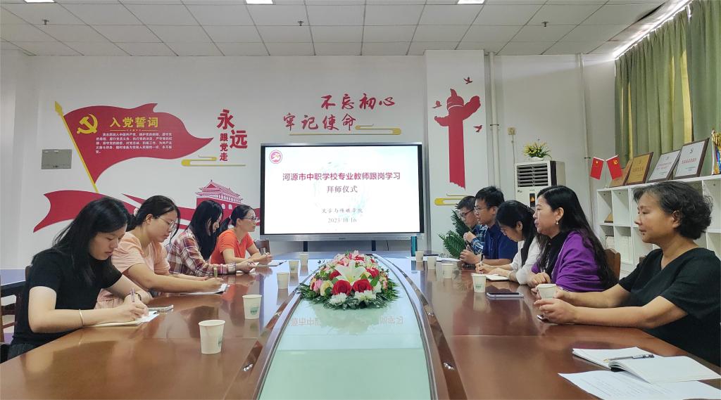 根据《广东技术师范大学与河源市教育局结对帮扶协议》和《2023年广东技术师范大学对口帮扶河源市中职学校实施方案》等文件要求,文学与传媒学院对对口帮扶河源市中职专业教师跟岗学习工作高度重视,对跟岗学习作了精心安排,为每一位学员配备经验丰富的优秀教师为导师。为有计划、按步骤完成好此项工作,切实提升跟岗教师的教学和科研能力,10月16日,文学与传媒学院为河源市中职学校跟岗学习的蔡云、罗伟燕、李小静、杨佩珊4位专业教师举行了隆重的拜师仪式,学院党委书记李双贵,院长项裕荣,副院长佘爱春,祁丽岩老师、尹世英老师参加了此次活动。