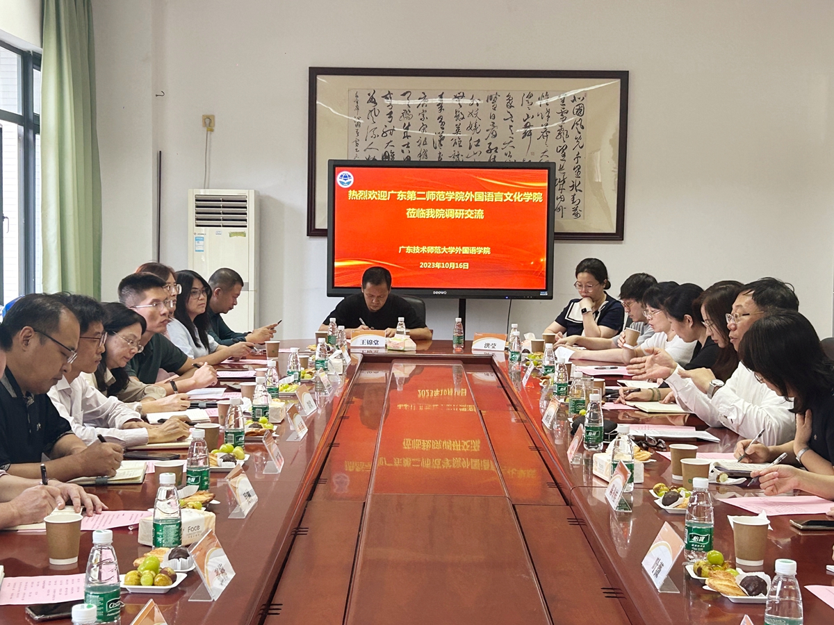 10月16日下午,广东第二师范学院外国语言文化学院党委书记曾令彬、副院长曹广涛、刘欢、党委副书记余镇生等一行15人到外国语学院调研交流。外国语学院党委书记杨伟光、院长徐玲、党委副书记王琴琴、副院长王永建以及相关专业负责人参加了座谈交流。