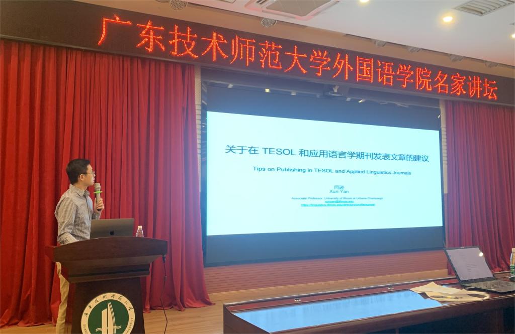 11月13日,伊利诺伊大学香槟分校闫逊副教授应邀在白云校区三教104讲学厅为外国语学院师生作题为《关于在TESOL和应用语言学期刊发表文章的建议》的学术讲座,讲座由外国语学院副院长陈倩主持,近三年新进博士、学院骨干教师及研究生参加了讲座。
