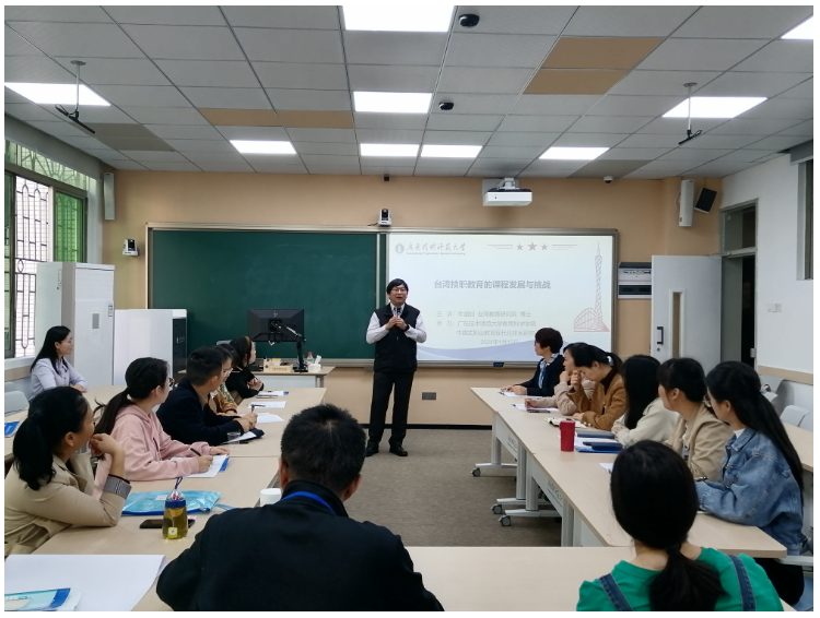 学术活动期间,1月18日,“两岸职教菁英‘湾区行’暨文化交流研讨会”在我校东校区第一教学楼106举行,来自省内外50余名专家学者参加研讨会。研讨会首先由台湾教育研究院课程及教学研究中心研究教师牛涵钊博士主讲,他以《台湾技职教育的课程发展与挑战》为题,从历史回顾、课程环境、课程设计、省思与建议等四个方面,全景式扫描了台湾技职教育的发展过程,呈现了台湾技职教育的生动图景。牛涵钊博士从哲学的高度,引用美国杜威“教育即生活”和英国斯宾塞“教育为未来生活之准备”之教育思想,认为“生活离不开技职,生活就是技职”,引发了在场专家学者对于教育、工作与生活的深度思考。