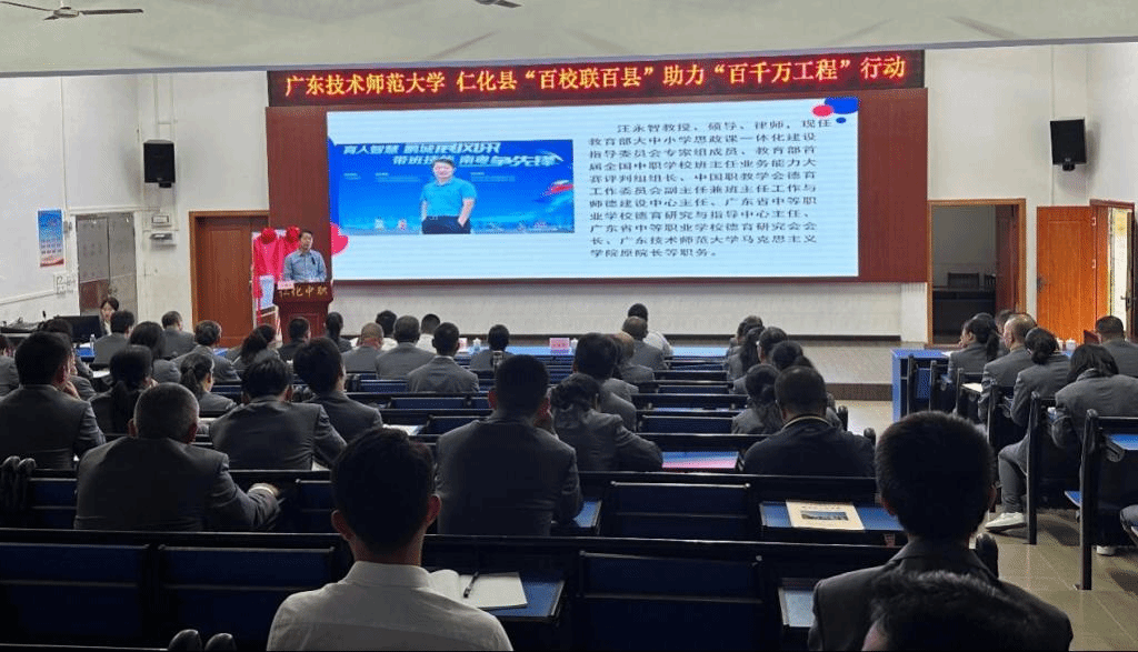 为落实省委“双百行动”工作部署和学校“双百行动”工作要求,11月8日,省中职德育中心主任汪永智教授赴仁化县举办“双百行动”系列专家讲座第一讲。仁化县教育局、县中职学校全体教师、“双百行动”驻县服务队等约100人参加。