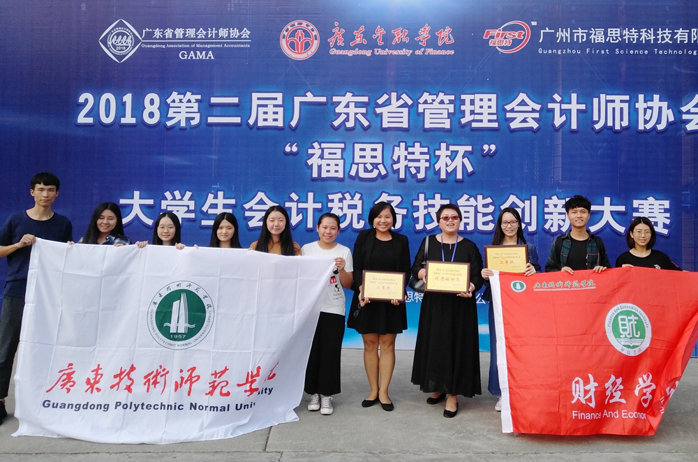 11月10日,2018年第二届广东省“福思特杯”大学生会计税务技能创新大赛总决赛在广东金融学院举行。我院财经学院学生代表1队(学生:柯丽萍,王茜,邱敬辉,庄静静,余思曼,指导老师:罗静)、学生代表2队(李佳杭黄泽平孔敏君陈颖欣冯丽园,指导老师:何文颖)表现出色,均获二等奖,我校获“优秀组织奖”。