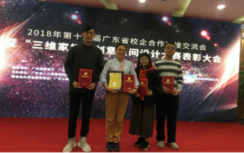 12月8日下午,美术学院环境设计系主任陈静敏带领获奖师生共同出席第十三届广东省校企合作对接交流会暨“三维家杯”创意空间设计大赛颁奖现场。在这次大赛中,美术学院获广东校园组“优秀组织奖”,陈超老师荣获“优秀导师奖”,环境设计专业学生吕一鸣、马银波、黎宇莹分别荣获“广东百强校园设计师优秀奖”。