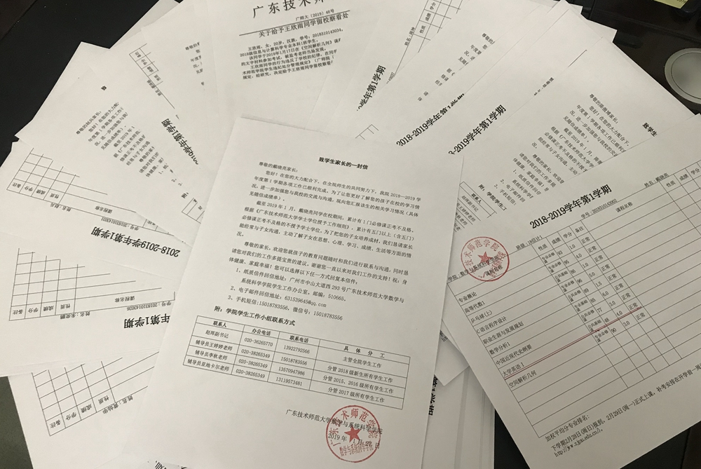 2018年6月21日,在新时代全国高等学校本科教育工作会议上,教育部长陈宝生指出:中国教育“玩命的中学、快乐的大学”现象应该扭转。数学与系统科学学院通过给家长邮寄成绩单的方式“劝学”,给混日子的大学生敲响了警钟。还给那些受处分学生的家长传递了广东技术师范大学学生违纪处分管理规定和违纪处分处理意见通知书。