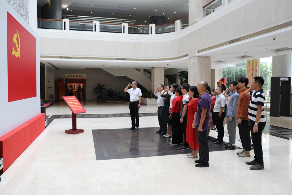 参观结束后,在一楼大厅鲜红的党旗前,党员们面对党旗,庄严地重温入党誓词。